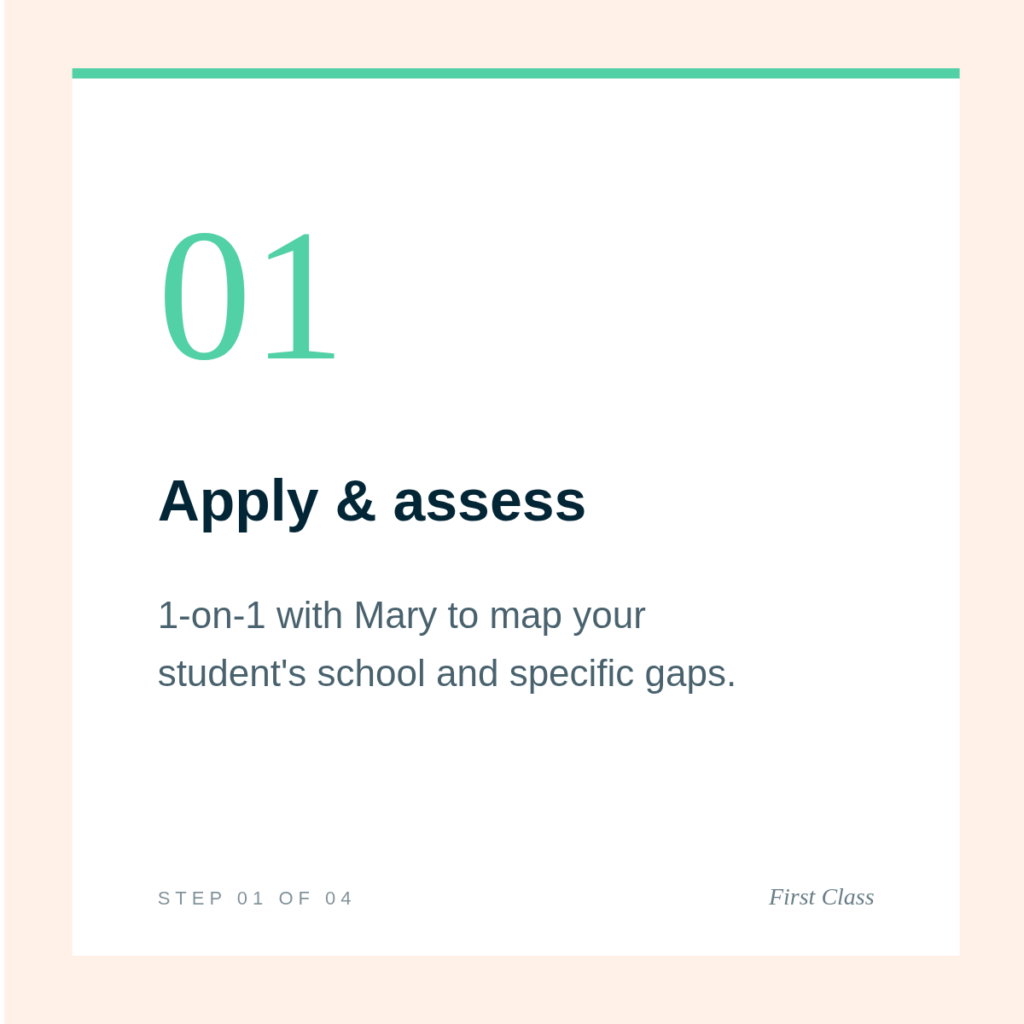 It starts with a 1-on-1 assessment. Every student begins First Class with a private 45-minute session with Mary. She walks through the First Class Checklist with your student, identifies where they already stand, and maps the work ahead.